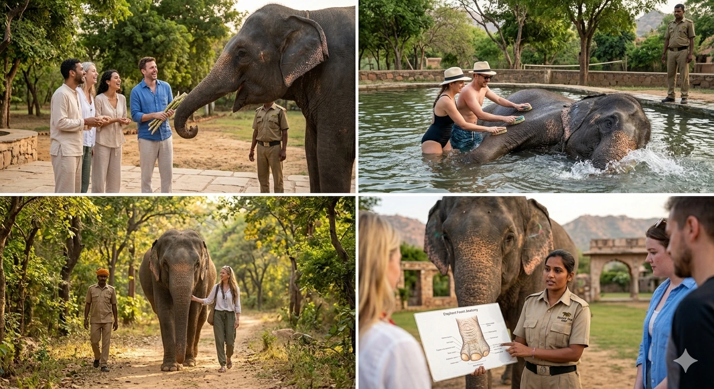 Visiting an elephant park in Jaipur is more than just sightseeing it’s about connection, learning, and respect. Here are some popular activities: