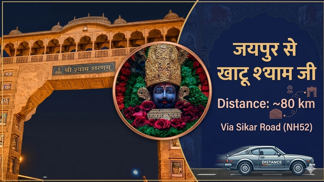 Jaipur to Khatu Shyam distance by road is roughly 80-89 km. (Jaipur से Khatu Shyam की दूरी लगभग 80 कि.मी. है.) This short route makes the pilgrimage to Khatu Shyam Ji the famed Barbarik temple in Sikar district, Rajasthan an easy drive of about 1–2 hours by car. For example, one popular route goes Jaipur → Ringas (≈62 km) → Khatu (≈18 km). Google Maps and travel guides agree on this distance: 77–80 km along NH-52, depending on your Jaipur start point.